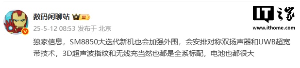 IT之家 5 月 12 日消息,据博主 @数码闲聊站 今日爆料,某厂 SM8850 大迭代新机搭载对称双扬声器和 UWB 超宽带技术,3D 超声波指纹和无线充也都是全系标配,电池也都很大。