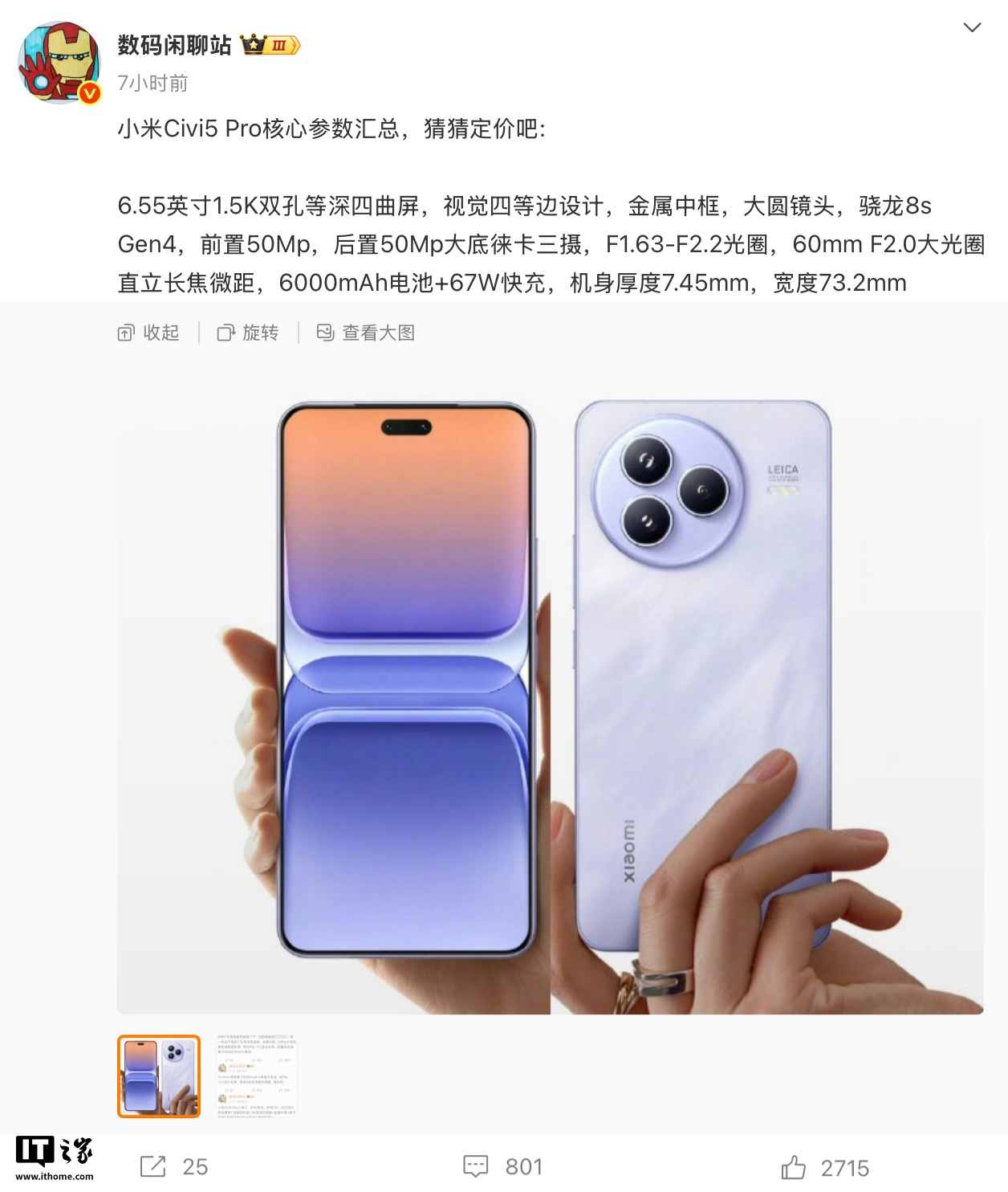 IT之家 5 月 17 日消息,博主 @数码闲聊站 发文,公布了小米 Civi5 Pro 核心参数,并披露了该机的外观照片。
