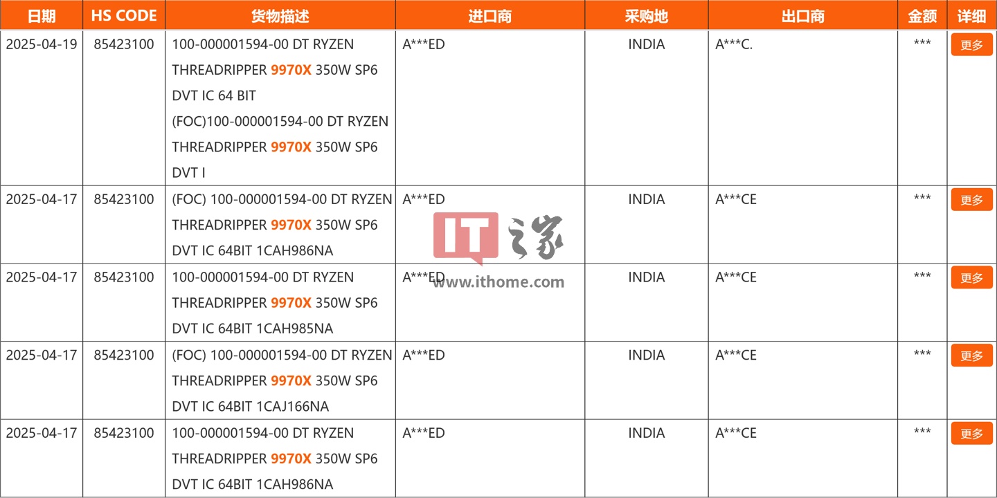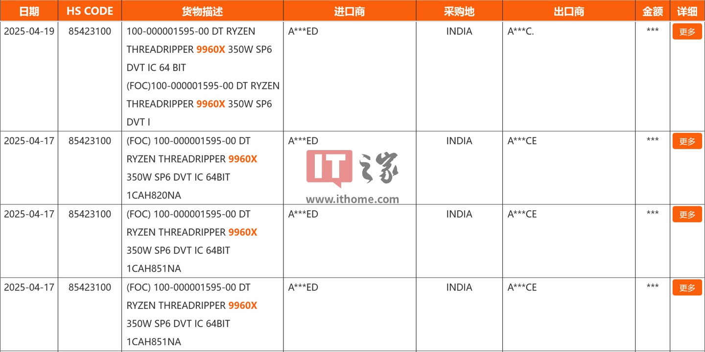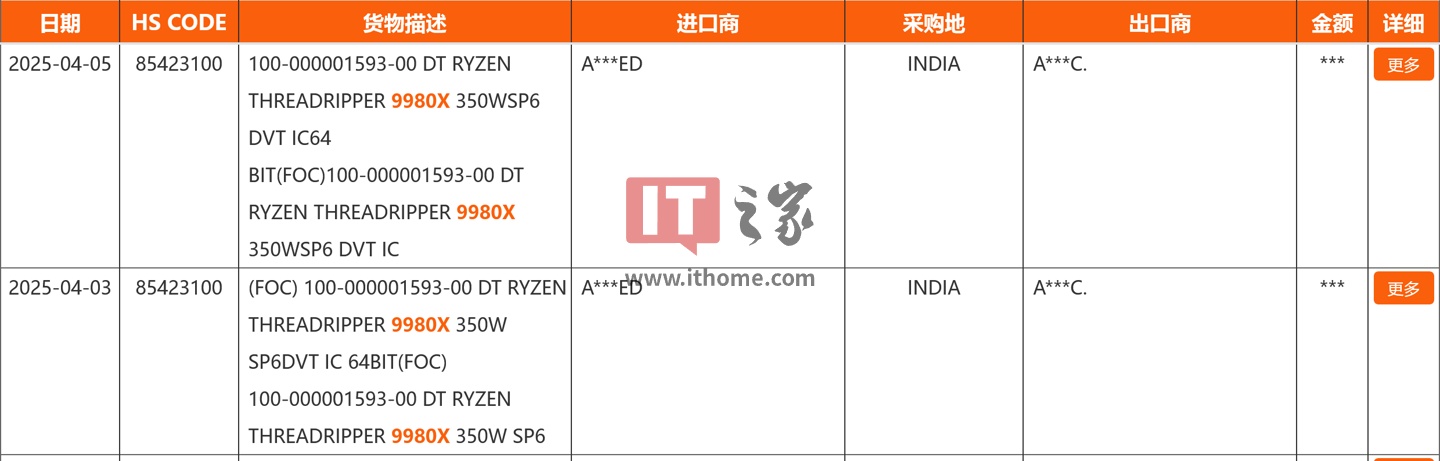 不过,X 平台数据挖掘者 @Olrak29_ 今日发现,三款非 PRO 版本的锐龙 Threadripper 9000 系列处理器 —— 9960X、9970X、9980X—— 的海关舱单信息也出现在了第三方平台 NBD 上。