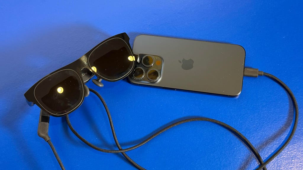 将Xreal One显示眼镜与iPhone连接。如今,智能眼镜和显示眼镜已能够与手机配合使用,但它们需要实现更紧密、更便捷的连接。Scott Stein/CNET