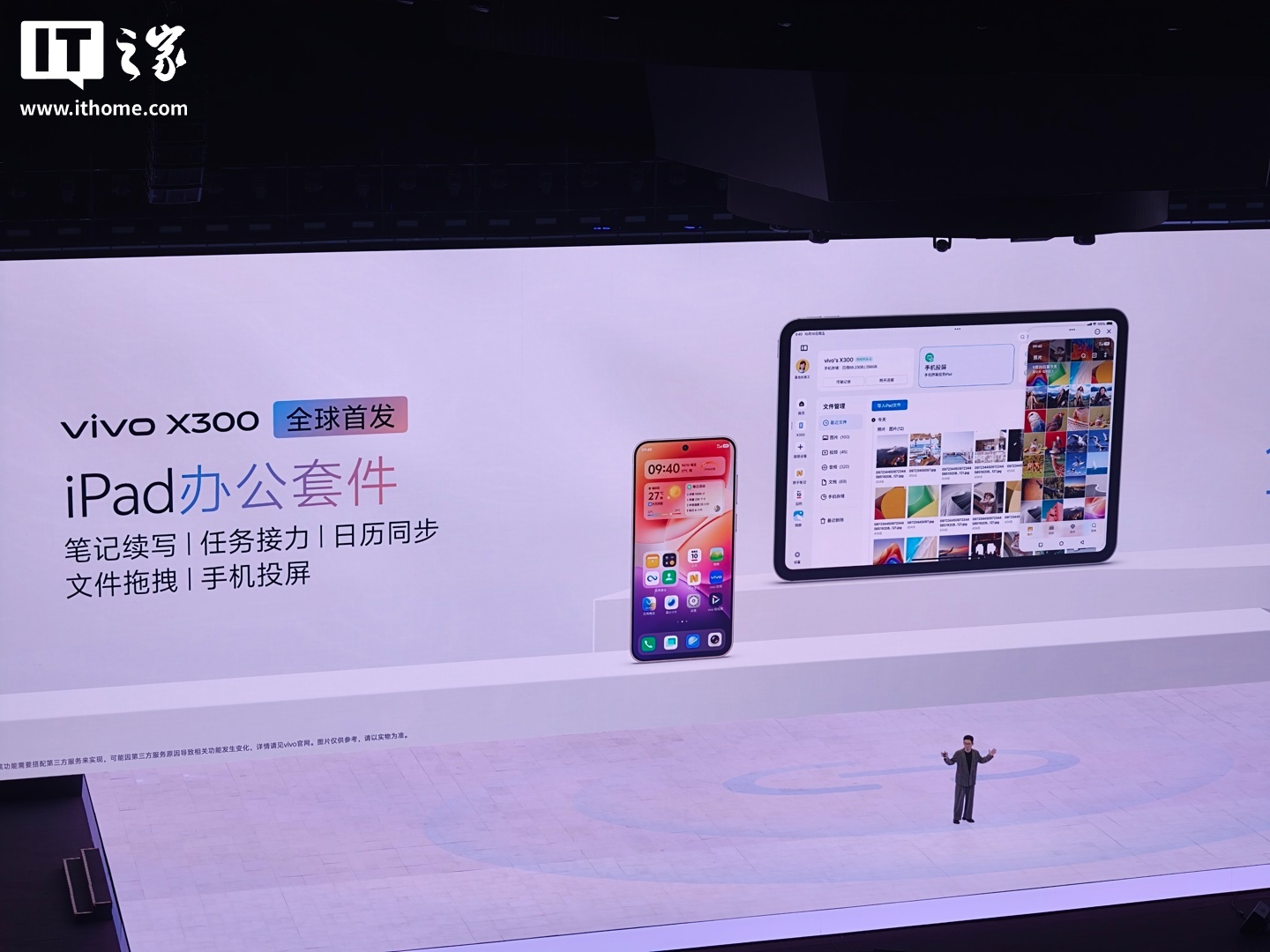 全球首发 iPad 办公套件,支持笔记续写、任务接力、日历同步等能力,还可在 iPad 和 vivo 手机间拖拽文件、投屏等,实现“用 iPad 操控 X300 系列手机”。