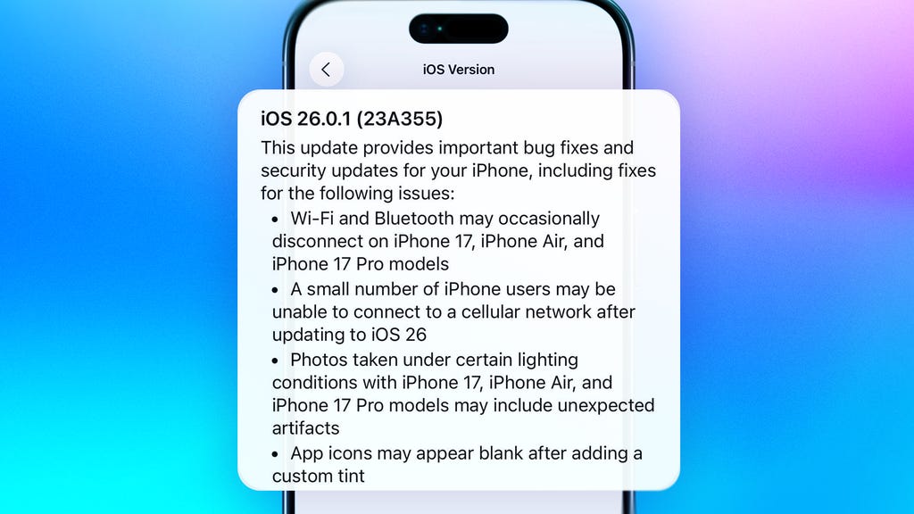 iOS 26.0.1应该能解决移动网络问题,以及蓝牙和Wi-Fi方面的其他问题。Cole Kan/CNET/苹果