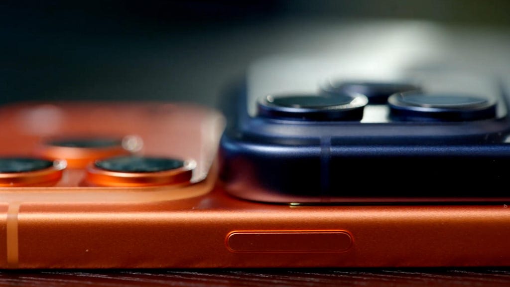 深蓝色iPhone 17 Pro和宇宙橙色iPhone 17 Pro Max。Celso Bulgatti/CNET