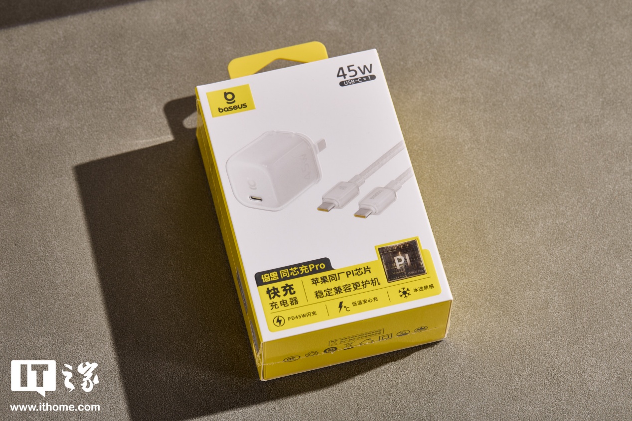倍思同芯充 Pro 充电头搭载“苹果同厂 PI 芯片”,功率可达 45W;外壳采用内外双层冰透设计,插脚采用可折叠设计,体积小巧能放进化妆包。
