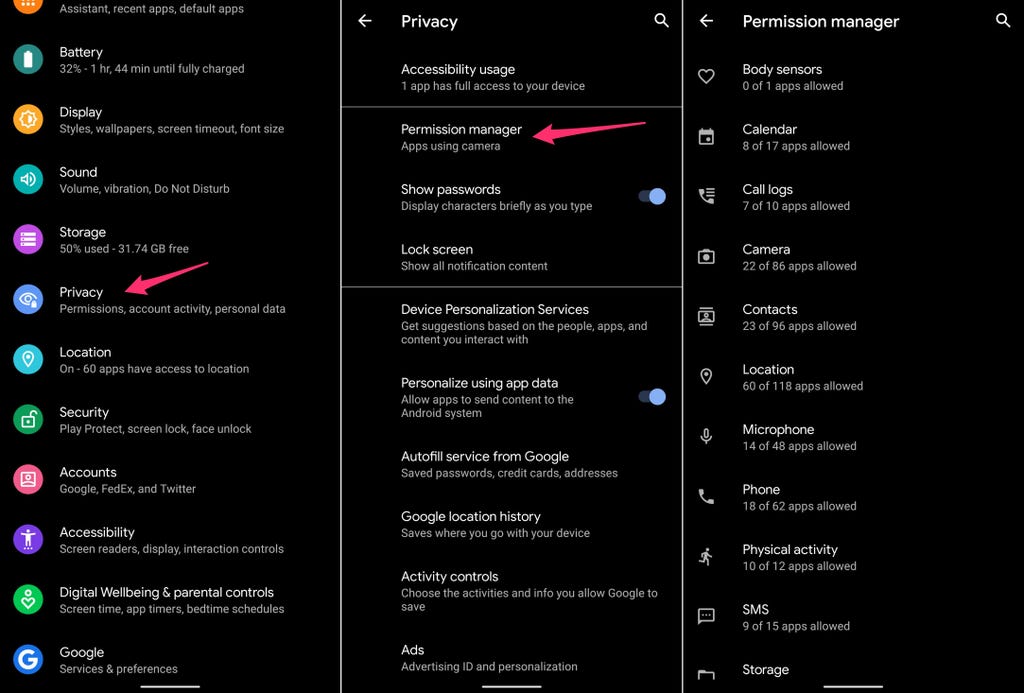 打开设置应用,然后点击隐私>权限管理器。浏览每个类别,看看哪些应用目前可以访问你的哪些个人数据“宝藏”。发现一个你不想让它访问你位置的应用?关掉它。联系人、日历或相机也是同样的道理。