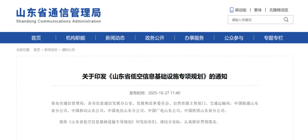 C114讯 10月27日消息(兰茜)今日,为加快构建现代化低空信息基础设施体系,推动低空经济高质量发展,打造低空运行安全可控、服务高效智能、产业协同发展的新格局,山东省通信管理局联合省发展改革委、省自然资源厅、省交通运输厅印发《山东省低空信息基础设施专项规划》(以下简称《规划》)。这是全国首个省级低空信息基础设施专项规划。