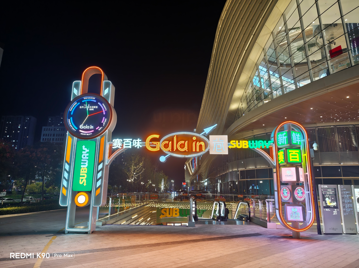 再看夜间拍摄的效果,首先是在商场门口使用标准模式直接拍摄的照片,画面明亮,色彩纯净自然,商场内部的高光控制也比较好,特别是细小的霓虹灯条也没有溢出,整个观感基本就是人眼所见。