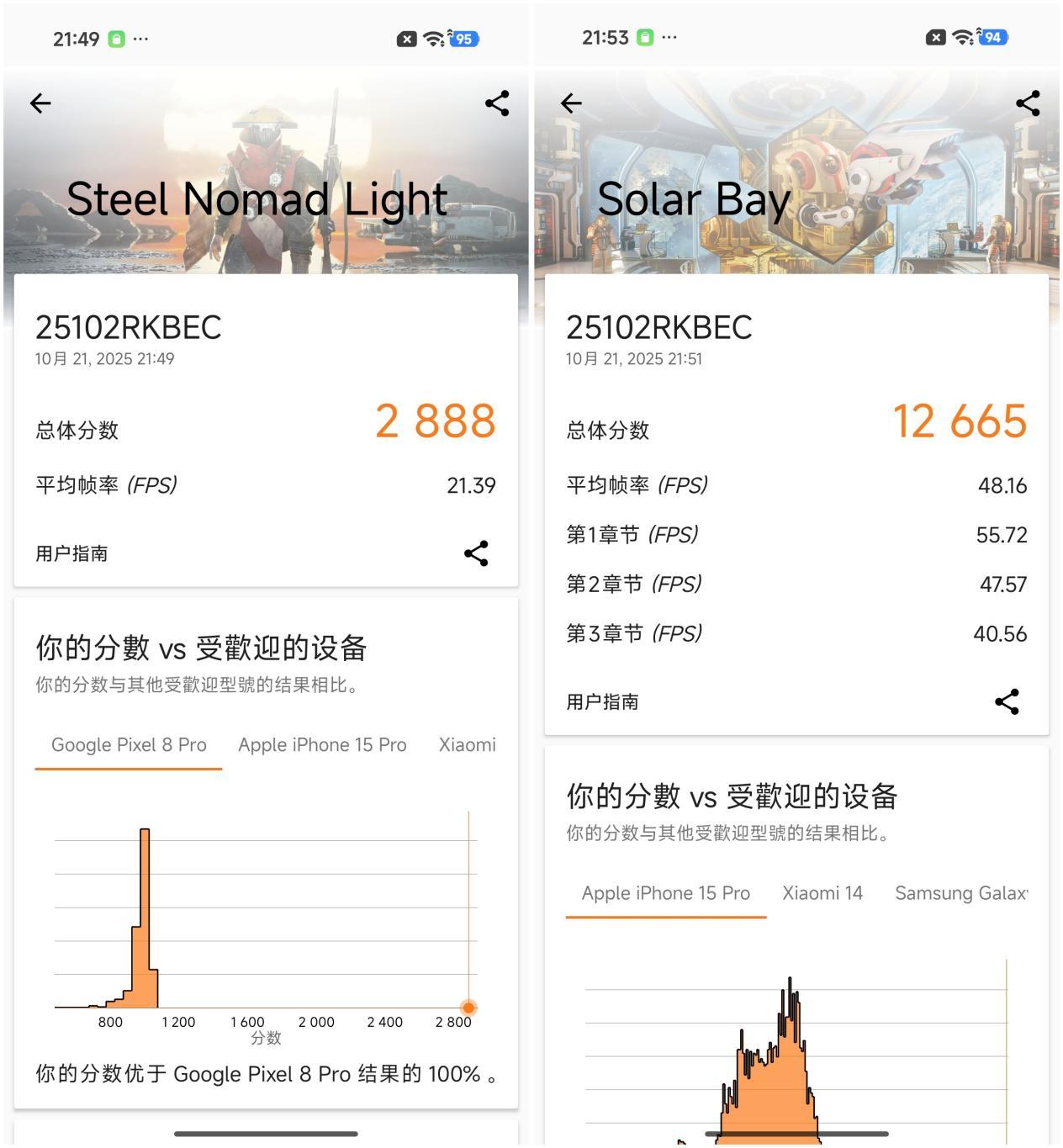 GPU 方面,IT之家使用 3D Mark 分别进行了代表移动图形计算性能的 Steel Nomad Light 项目和代表光追性能的 Solar Bay 项目测试,其中 REDMI K90 Pro Max 在 Steel Nomad Light 项目中的成绩为 2888 分,平均帧率 21.39 FPS,在 Solar Bay 项目中成绩为 12665 分,平均帧率 48.16 FPS。