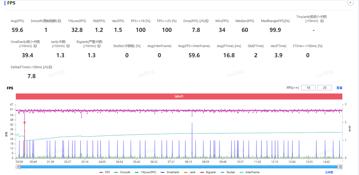 跑图 15 分钟后,测得游戏运行平均帧率为 60 FPS,整个过程也没有遇到卡顿掉帧的情况,帧率曲线上几乎没什么波动。