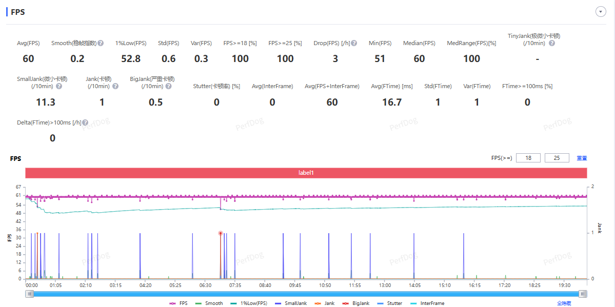 测试结束后,得到平均帧率为 59.6 FPS,帧率曲线整体上较为平稳,游玩体感上偶尔会感觉到一下帧数波动,但不明显,不影响体验。