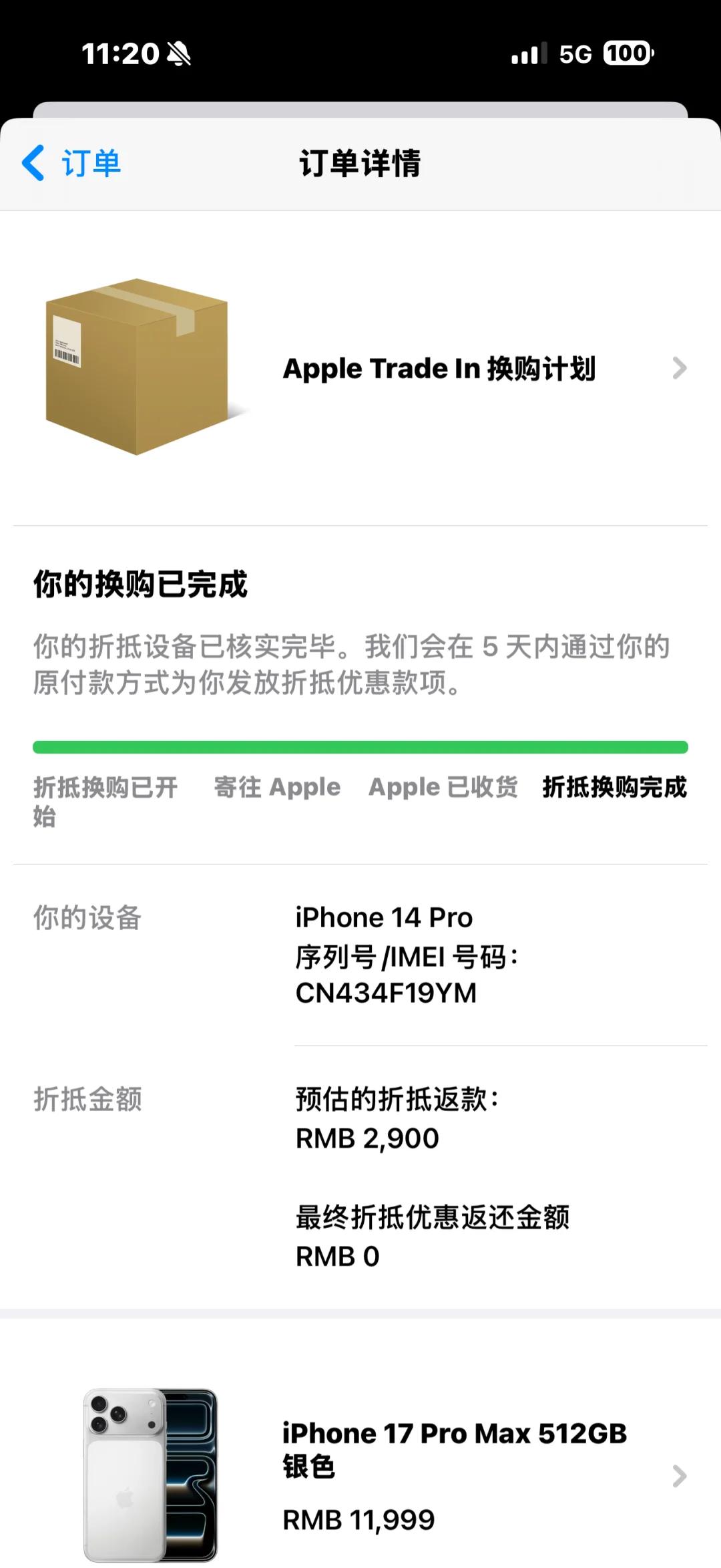 网友表示,在苹果官网购买iPhone 17 Pro Max(11999元),用旧机iPhone 14 Pro抵扣,官方承诺抵扣2900元。