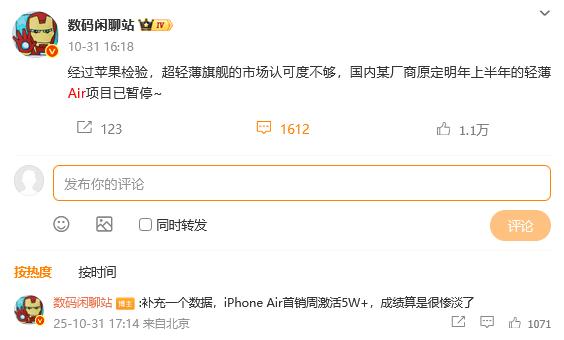 科技博主@数码闲聊站 日前也透露称,iPhone Air国内首销周(10.22 - 10.29)激活量仅5万余台,“成绩算是很惨淡了”。其还表示,经过苹果检验,超轻薄旗舰的市场认可度不够,国内某厂商原定明年上半年的Air项目已暂停。