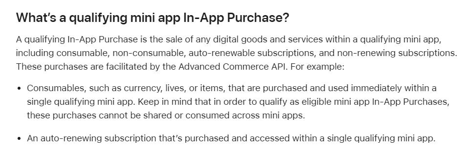 除此之外,其还对“符合条件的 Mini Apps App内购买”进行了明确规定:是指在符合条件的“Mini Apps”内进行的任何数字商品和服务的销售,包括消耗型、非消耗型、自动续期订阅和非续期订阅。也就是说,加入该计划的开发者在销售以上 App 内购买项目时,仅需将销售额的 15% 作为佣金。而这一比例较常规 30% 的苹果佣金下降了 50%。