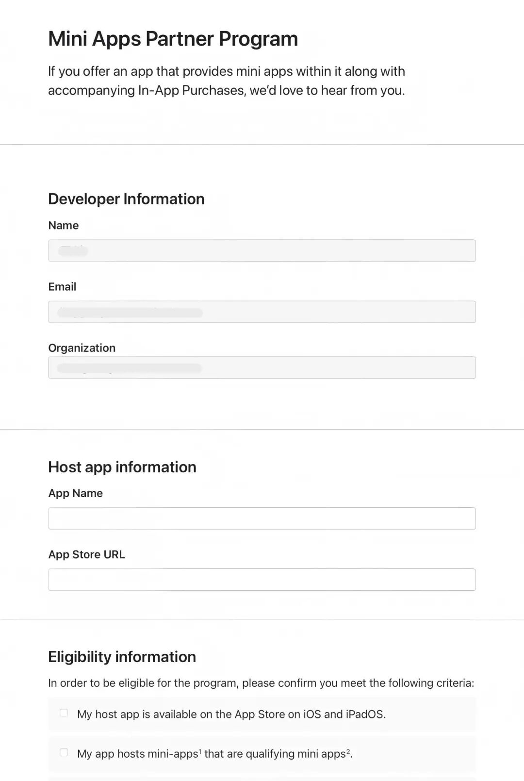 如果想要参与该计划,开发者需首先成为苹果开发者计划(Apple Developer Program)的"账户持有人",然后提交申请表,提供宿主应用(即托管小程序和小游戏的开发者 App)、资格条件和小程序相关信息,并同意计划条款。在获得批准后,开发者将收到配置指导邮件。其中包含设置详情,以帮助开发者配置相关服务。