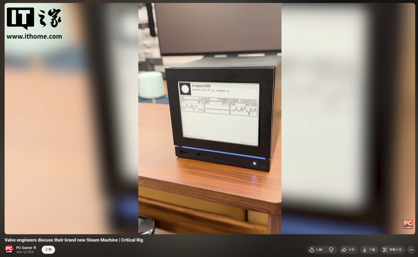 同时V社内部还有一台不一样的 Steam Machine 工程机,它的前面板搭载一块 E-Ink 电子墨水屏,可以直接显示 CPU 频率、内存占用、温度等硬件实时信息。