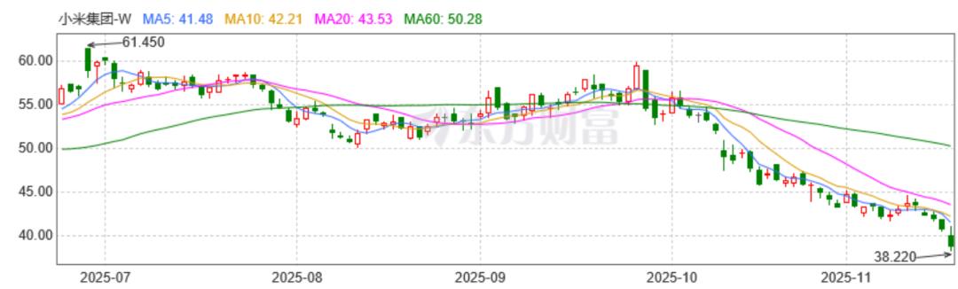 今年6月以来,小米集团股价整体持续走低,昨日的收盘价与6月61.450港元/股的高点相比,已累计下跌达36.83%。