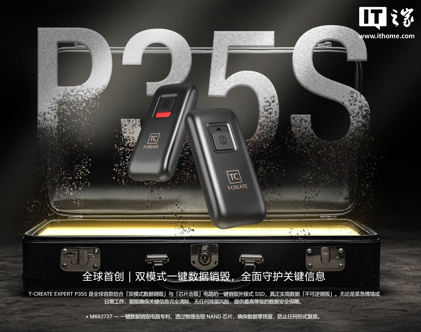 IT之家 11 月 20 日消息,十铨科技官方今天在公众号平台发文,宣布推出全球首款一键销毁外接式固态硬盘 T-CREATE EXPERT P35S,专为保存高机密数据设计。