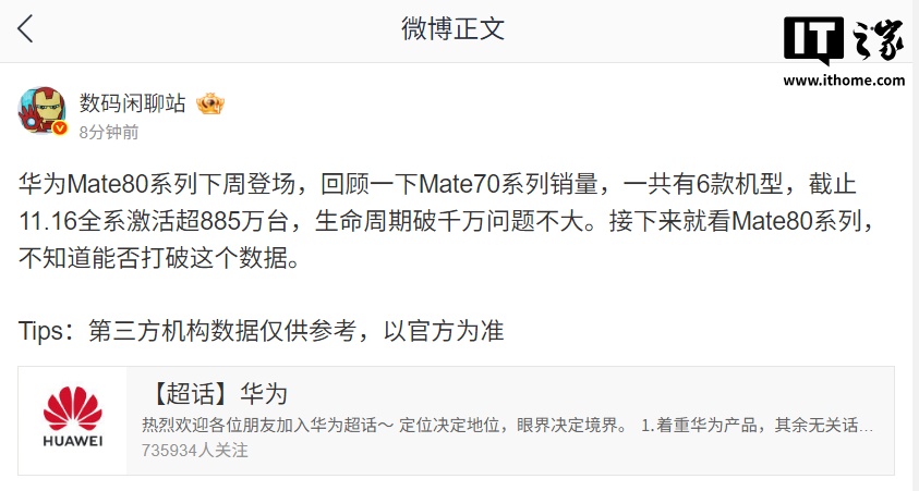 回顾一下 Mate70 系列销量,一共有 6 款机型,截止 11.16 全系激活超 885 万台,生命周期破千万问题不大。接下来就看 Mate80 系列,不知道能否打破这个数据。