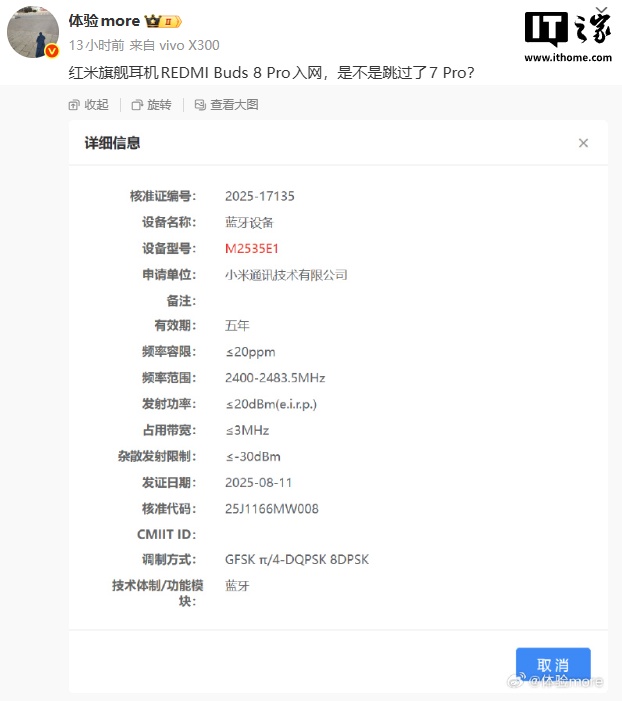 IT之家 11 月 24 日消息,一款型号为 M2535E1 的小米新品今年 8 月通过了工信部无线电核准,博主 @体验more 昨晚透露,该产品为 REDMI Buds 8 Pro 耳机。