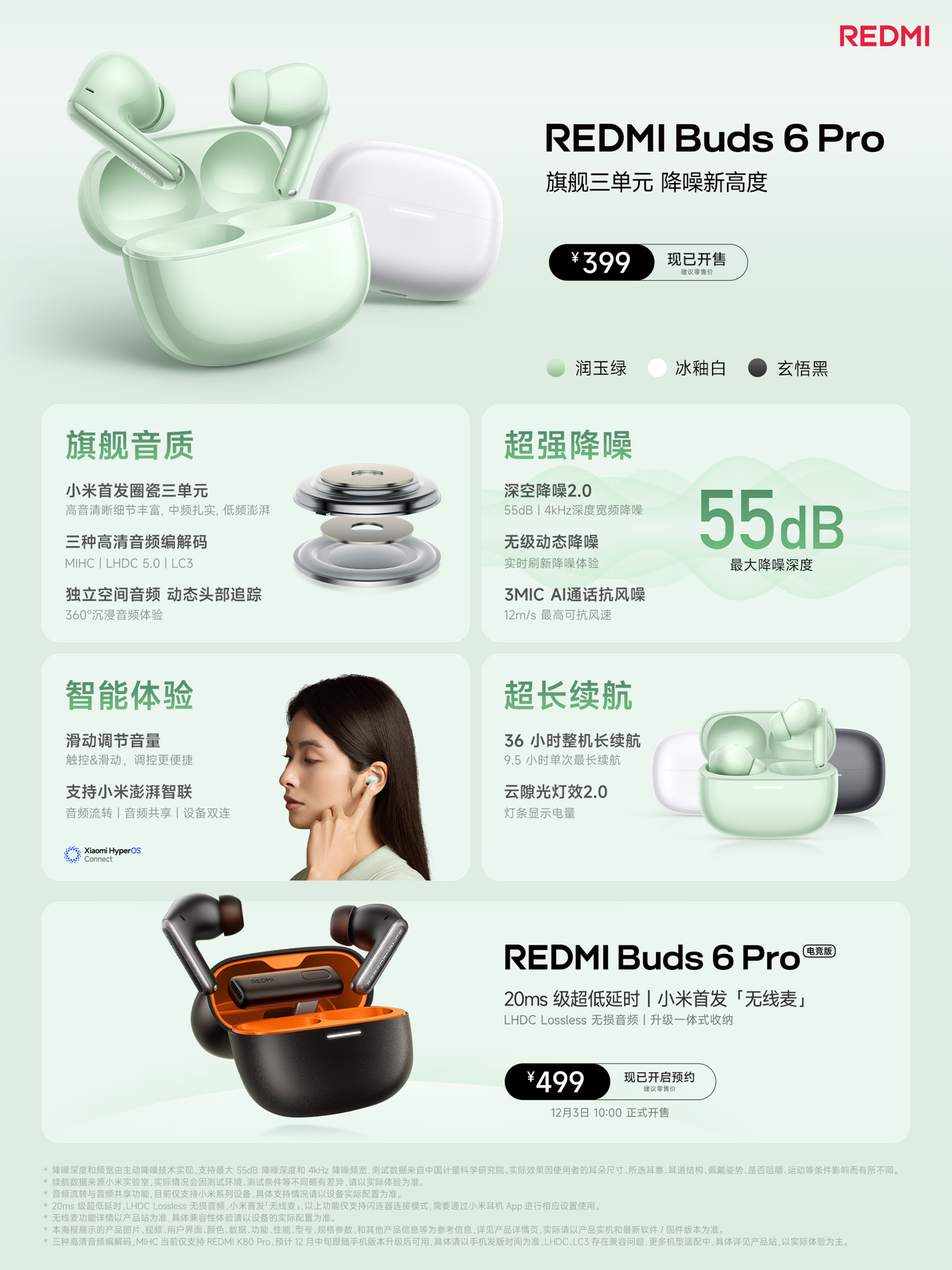REDMI Buds 6 Pro 小米首发圈瓷同轴三单元,支持深空降噪 2.0(IT之家注:55dB 降噪深度)、旗舰级自研降噪算法,还支持滑动调节功能、云隙光电量显示、全民 K 歌耳返等功能。