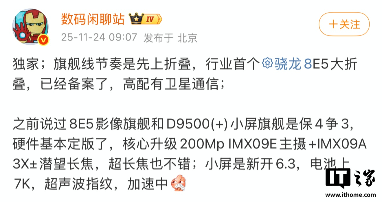 IT之家 11 月 24 日消息,博主 @数码闲聊站 今日爆料,某厂旗舰线节奏是先上折叠,行业首个第五代骁龙 8 至尊版大折叠,已经备案了,高配有卫星通信。结合该博主此前的爆料习惯,预计为 OPPO Find N6。