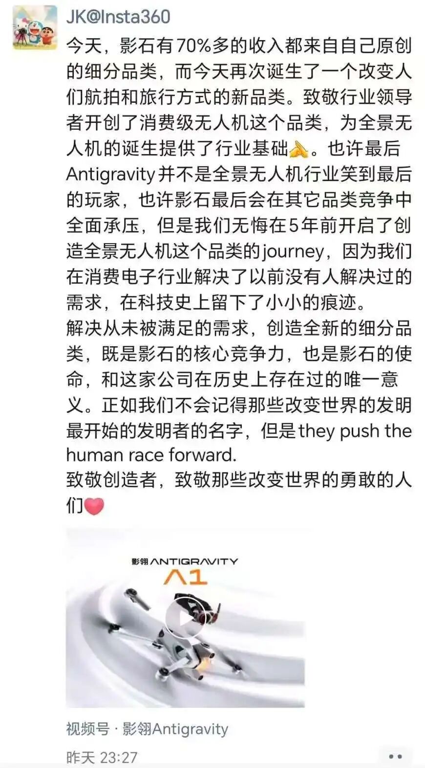 刘靖康在当天的朋友圈里提到,“也许影石最后会在其他品类竞争中全面承压。”