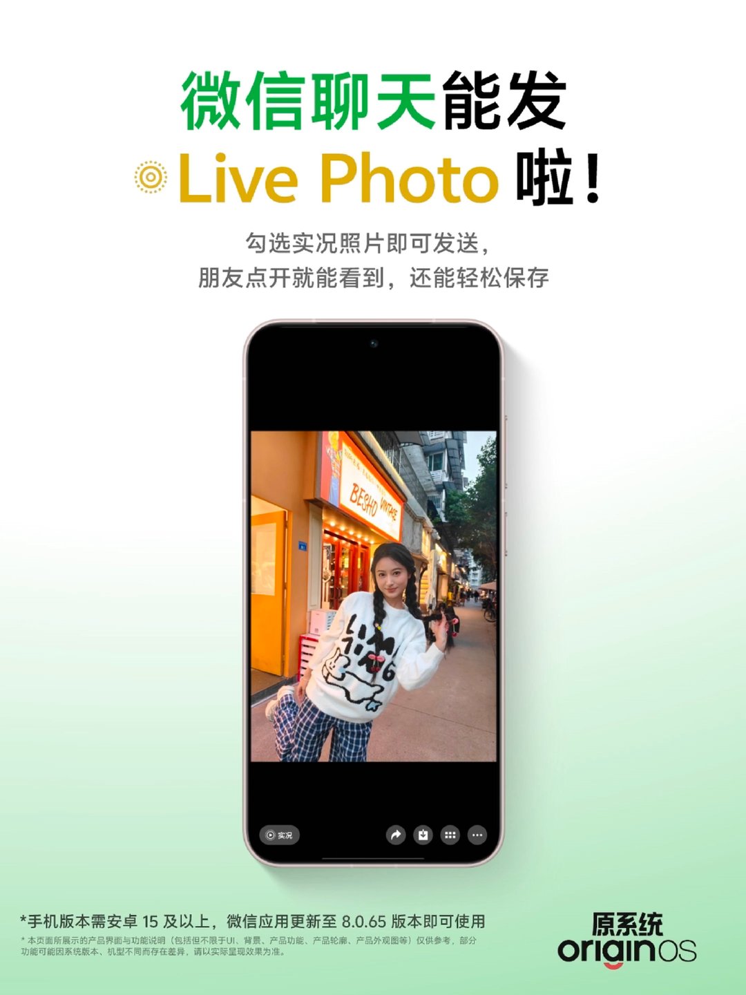 据IT之家此前报道,OPPO ColorOS 在 12 月 4 日宣布支持微信聊天框收发实况照片:打开微信聊天框,点击「+」选择实况照片,勾选左下角的「实况」直接发送,对方点开就能看到动态效果。另外,vivo OriginOS 也在 12 月 5 日宣布微信聊天支持发送实况照片。