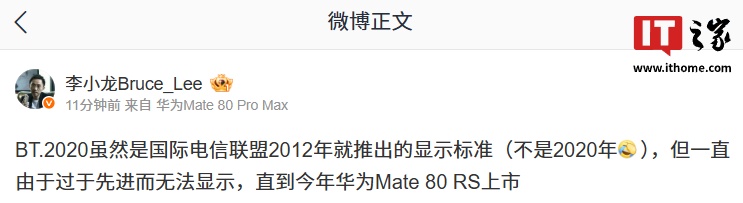 IT之家 12 月 8 日消息,华为终端 BG CTO 李小龙今日发文称,BT.2020 虽然是国际电信联盟 2012 年就推出的显示标准(不是 2020 年),但一直由于过于先进而无法显示,直到今年华为 Mate 80 RS 上市。