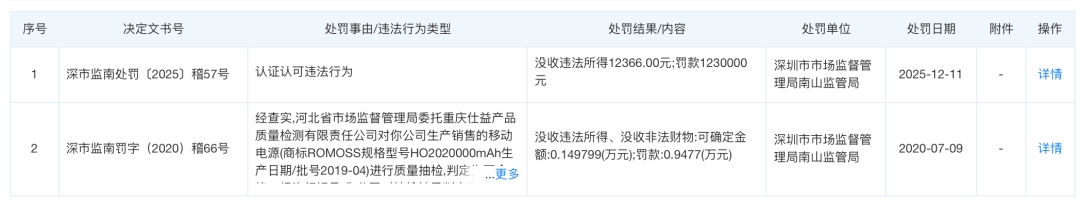 天眼查显示,因公司生产销售的移动电源(商标ROMOSS规格型号HO2020000mAh生产日期/批号2019-04)在质量抽检时被判定为不合格,2020年7月,罗马仕还曾被深圳市市场监督管理局南山监管局没收违法所得、没收非法财物:可确定金额约0.15万元,罚款约0.95万元。