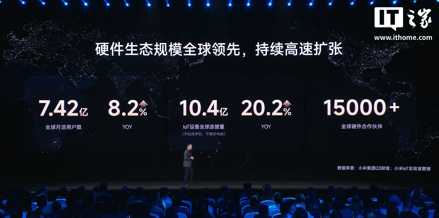 IT之家从大会获悉,小米全球月活跃用户数达 7.42 亿,同比增长 8.2%;IoT 设备全球连接数达 10.4 亿,同比增长 20.2%。