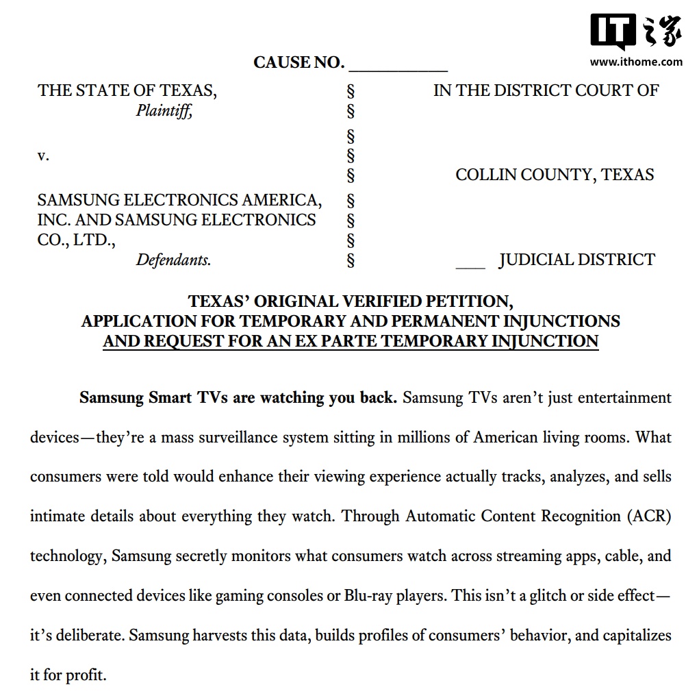 IT之家 12 月 17 日消息,科技媒体 Ars Technica 今天(12 月 17 日)发布博文,报道称美国得克萨斯州总检察长肯・帕克斯顿(Ken Paxton)起诉三星、LG、索尼、海信和 TCL 五大电视制造商,指控其利用自动内容识别(ACR)技术,在未经用户知情同意的情况下进行“大规模监视”。