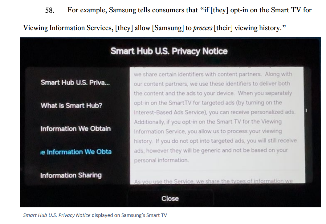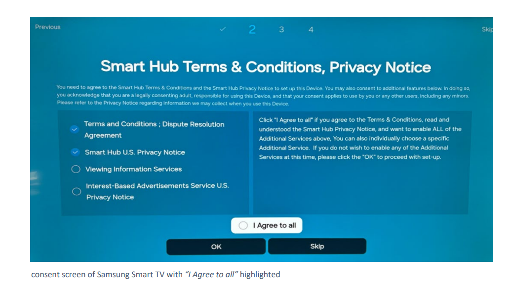 起诉书指出这五大制造商为获取数据,设计了极具欺骗性的用户界面。以三星为例,诉讼指出其在开机设置中引导用户开启 ACR。