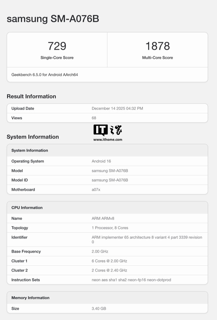 IT之家 12 月 17 日消息,科技媒体 Notebook Check 昨日(12 月 16 日)发布博文,报道称型号为 SM-A076B 的手机现身 GeekBench 跑分库,基于三星命名规则,该机上市后名为 Galaxy A07 5G,将会是三星最便宜的 5G 手机。