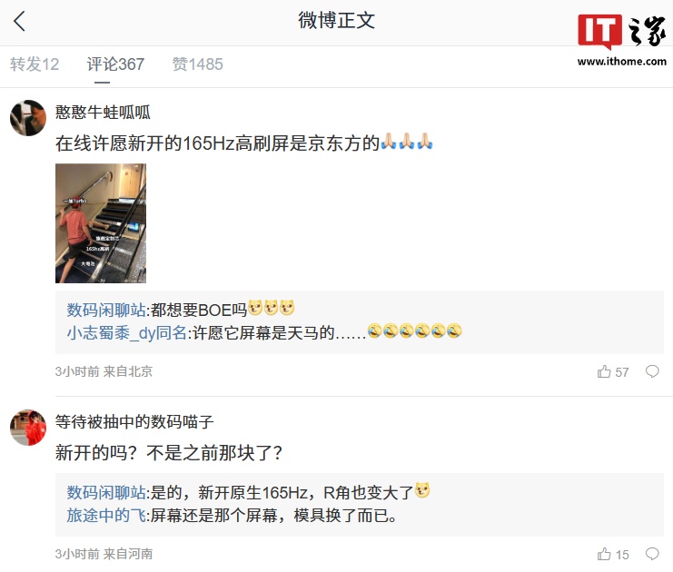 有网友询问这块 165Hz 高刷屏不是之前那一块吗?博主回复称:“是的,新开原生 165Hz,R 角也变大了。”