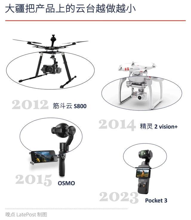 2015 年,大疆工程师们发现一些用户买了无人机却不让它飞,而是拿在手上边走边拍视频——无人机的云台可以降低画面抖动。他们受此启发,做了灵眸 OSMO——在苹果大小的大疆无人机云台上,加上 4K 摄像头和手持握杆,用户把手机架在上面当屏幕,在走动中拍摄出稳定画面。