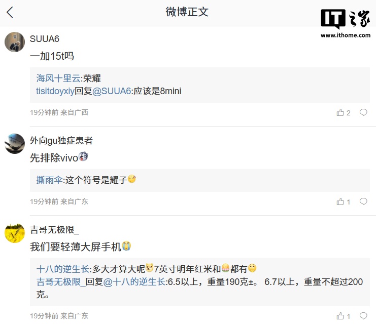 IT之家注意到,博主还在评论区与网友展开互动:针对 iQOO 是否会推出小屏机,他表示:“目前项目暂停了。”针对一加 15T 新机何时发布,他回复:“也做好了,排期明年 3-4 月。”另外,还有用户询问小米 17 Ultra 新机为什么还不预热,博主直接回复了三个狗头表情:“”