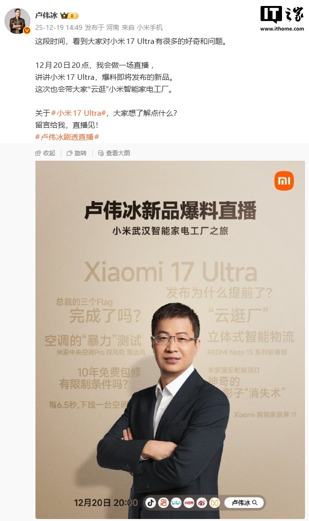 IT之家 12 月 19 日消息,小米集团合伙人、总裁卢伟冰今日宣布,12 月 20 日 20 点进行一场直播,讲讲小米 17 Ultra,爆料即将发布的新品,这次也会带大家“云逛”小米智能家电工厂。