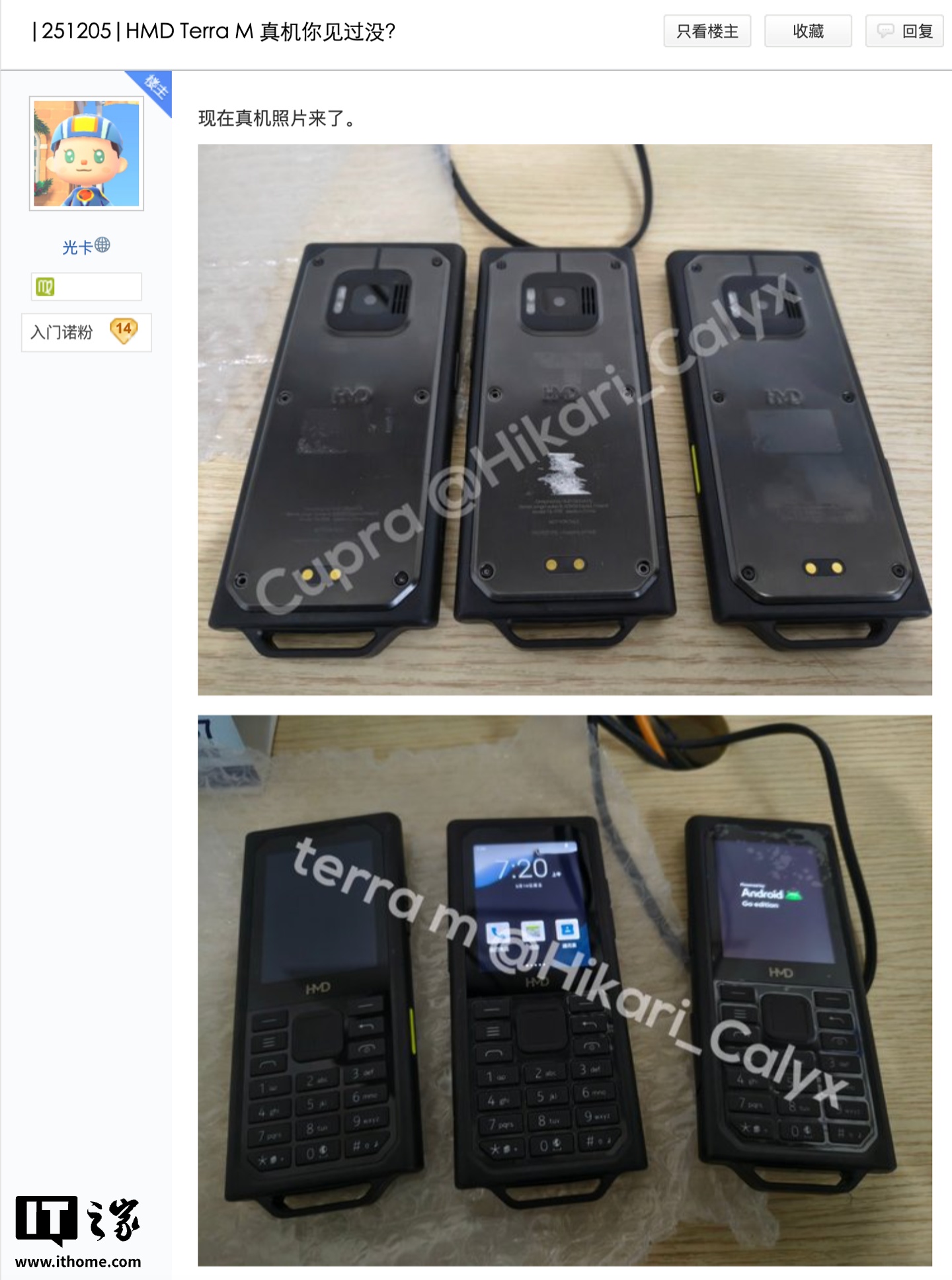 IT之家 12 月 19 日消息,HMD Global 在今年 11 月推出了 Terra M 三防功能机,该机将于明年第一季度上市。而目前消息源 Hikari_Calyx(光卡)在诺记吧公布了这款手机的真机谍照,显示该机造型紧凑,运行安卓系统。