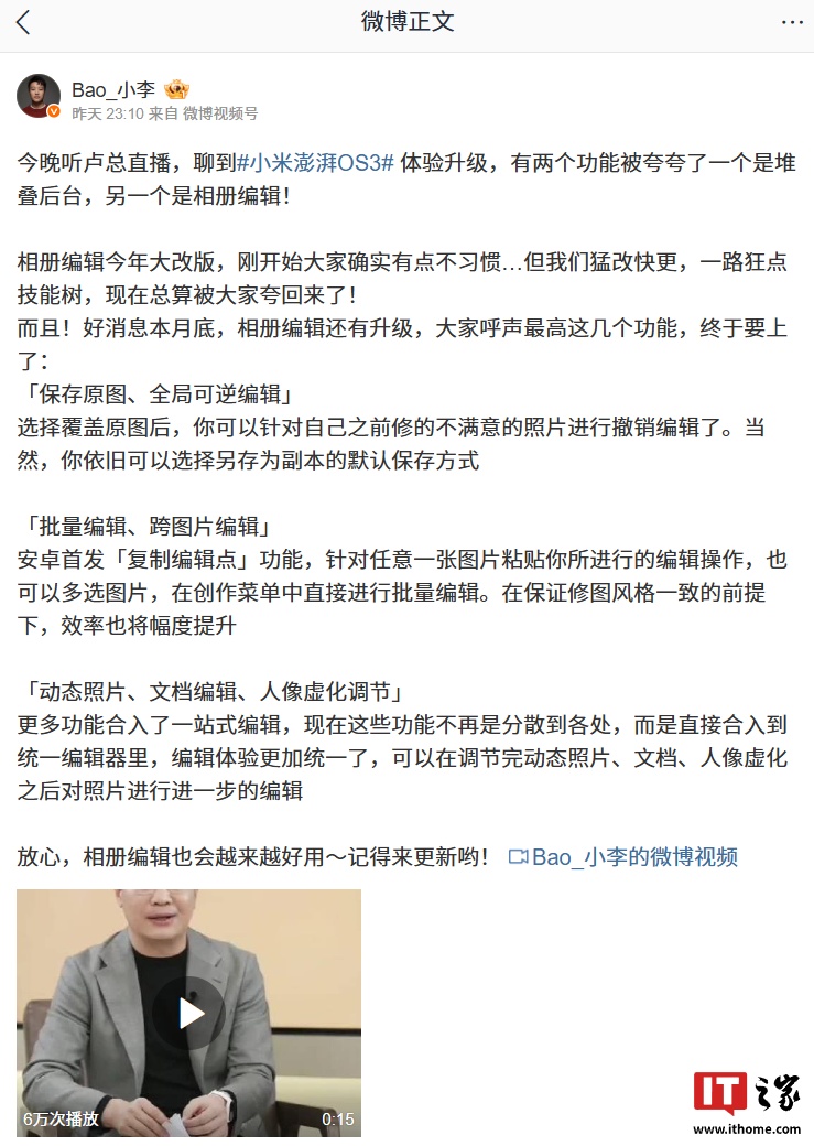 小米相机部的产品经理 @Bao_小李 今日还发文提醒,称「覆盖原图」和「批量编辑」需要小米澎湃 OS 3 系统,并且需要相册更新至 4.3.0.60 及以上版本。他表示,这两个功能,影响了很多图片的显示逻辑和云同步的逻辑。