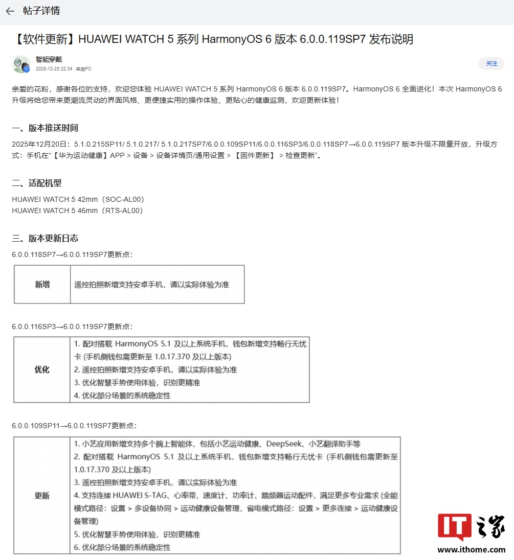 IT之家 12 月 21 日消息,据华为官方团队账号 @智能穿戴 分享,HUAWEI WATCH 5 系列智能手表已开启 HarmonyOS 6.0.0.119SP7 版本升级。据介绍,本次系统更新不限量开放,用户在“【华为运动健康】App > 设备 > 设备详情页 / 通用设置 > 【固件更新】 > 检查更新”即可。