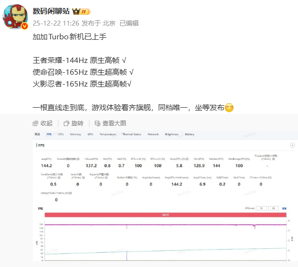IT之家 12 月 22 日消息,博主 @数码闲聊站 今日发文称一加 Turbo 新机已上手,确认支持《王者荣耀》144Hz 原生高帧、《使命召唤》165Hz 原生超高帧、《火影忍者》165Hz 原生超高帧。