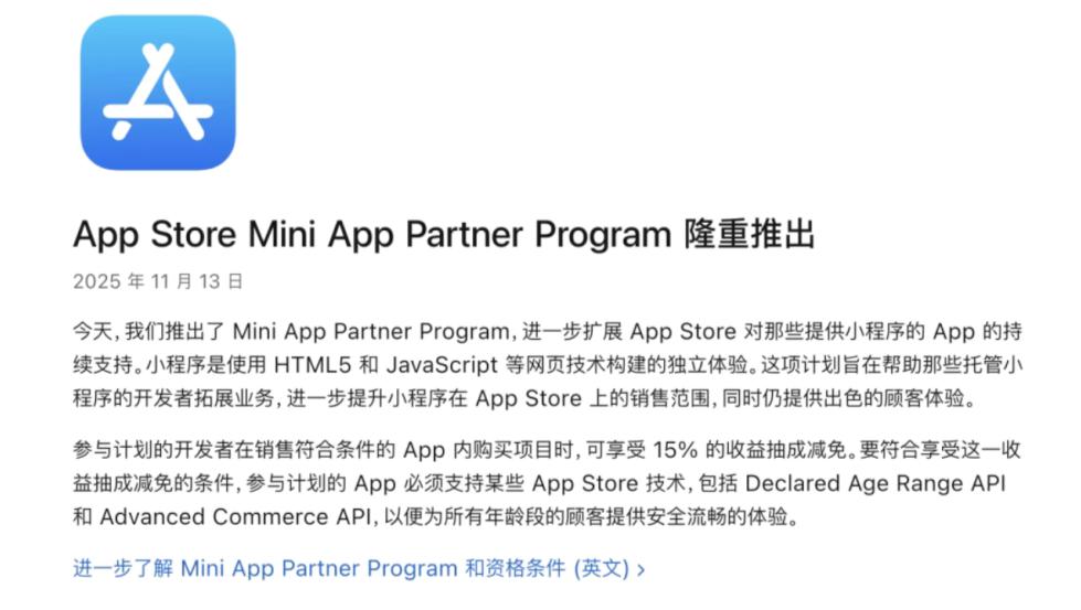 今年11月,苹果与腾讯(微信)达成小程序抽成协议,把原本30%的佣金降到了15%,这也是苹果近年来第一次主动调整中国内地市场的抽成政策。