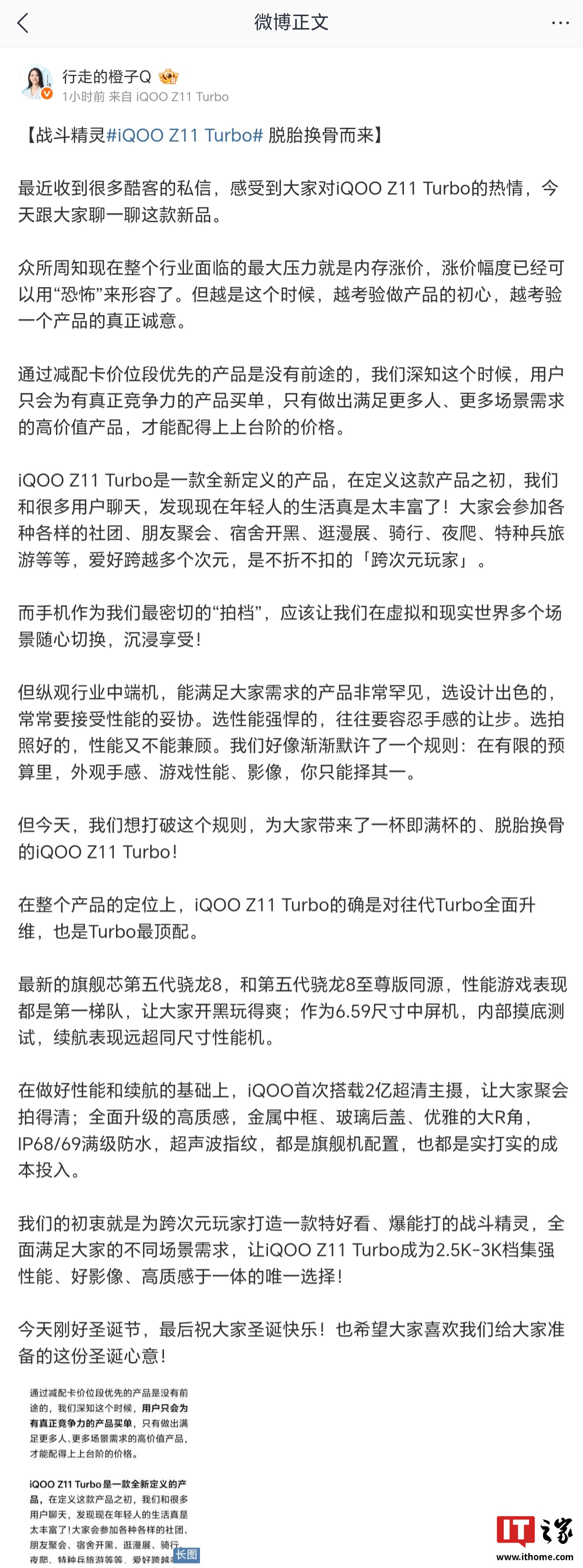 IT之家 12 月 25 日消息,iQOO Z 系列产品经理邢程今日谈起了 iQOO Z11 Turbo 新机,她表示现在整个行业面临的最大压力就是内存涨价,涨价幅度已经可以用“恐怖”来形容,越是这个时候,越考验做产品的初心。