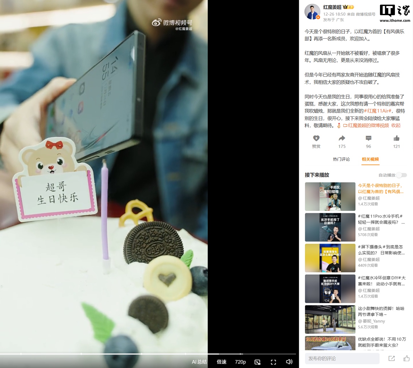 IT之家 12 月 28 日消息,红魔游戏手机产品总经理姜超本周(12 月 26 日)发布了一条庆祝自己生日的短视频,并在视频中展示了尚未发布的红魔 11 Air 新机的正面外观。