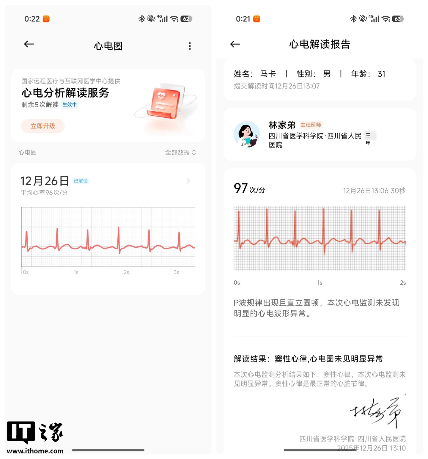 健康监测的另一大升级是 ECG 心电采集功能。用户只需将手指按在手表右下侧的触控按键上 30 秒,即可生成详细的心电图,目前该功能已通过二类医疗器械认证,能够及时预警房颤、心率失衡等风险。配合小米运动健康 App,还提供 6 次免费的专业医疗机构在线分析。