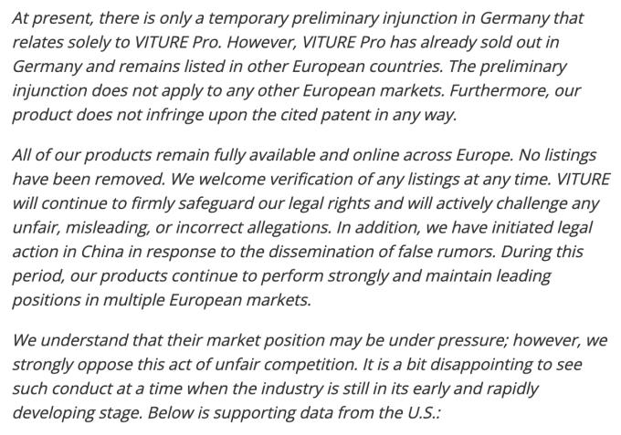 国内有媒体称当时就裁定结果以及经销商的说法向VITURE官方求证,得到的回复是:“You can always purchase our product on viture.com or on Amazon. Our product should not be banned from Germany.(您始终可以在viture.com或亚马逊上购买我们的产品。我们的产品不应该在德国被禁止。)”