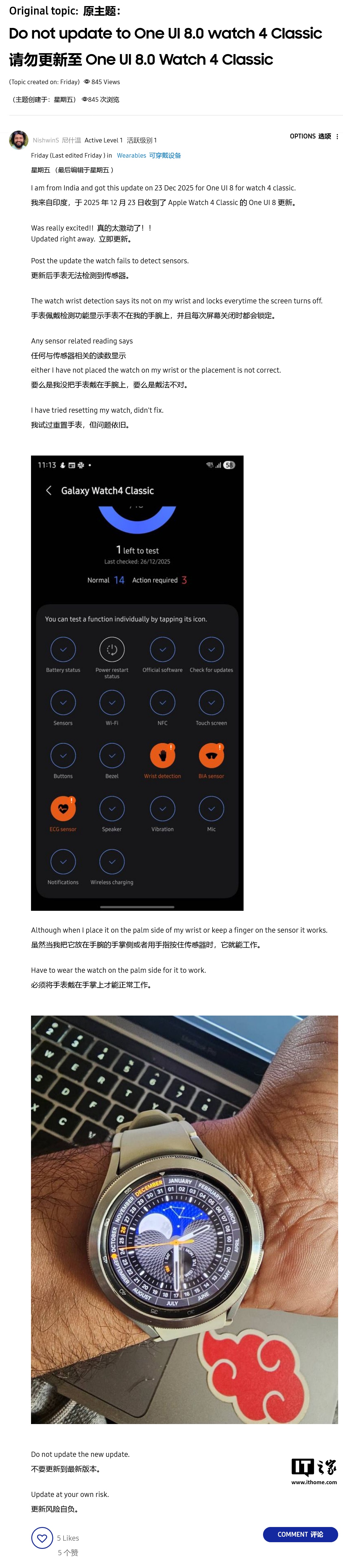 同时,软件层面的 BUG 还导致无法正常加载部分三星官方表盘,甚至连全天候显示(AOD)功能也彻底罢工。尽管有用户尝试通过清除缓存或将表盘佩戴在手腕内侧(手心侧)来临时规避传感器问题,但这并非长久之计。