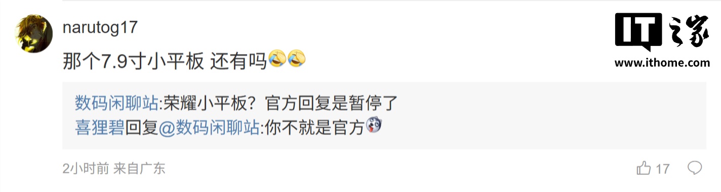 后续有用户在评论区询问:“那个 7.9 寸小平板还有吗 ”,博主回复道:“荣耀小平板?官方回复是暂停了”。