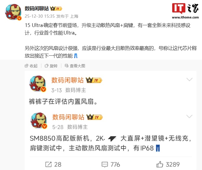 IT之家 12 月 30 日消息,据博主 @数码闲聊站 今日透露,某厂 15 Ultra 新机(结合暗示表情和评论区讨论来看,预计为 iQOO 15 Ultra)确定春节前登场,升级主动散热风扇 + 肩键,有一套全新未来科技感设计,是行业首个性能 Ultra。