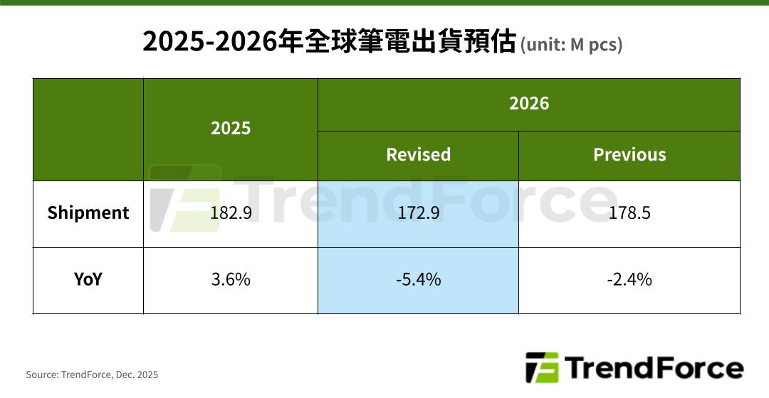 IT之家 12 月 30 日消息,TrendForce 集邦咨询今日再次下调了对 2026 年全球笔记本电脑出货规模的预测,同比降幅从此前的 2.4% 扩大至 5.4%,对应 1.729 亿台。